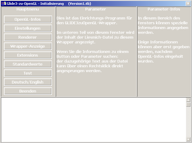 OpenGL-Infos: Hier können Informationen zum OpenGL-Treiber angefordert werden. Einstellungen: Hier können sie allgemeine Einstellungen vornehmen, die das Erscheinungsbild vom Render-Fenster betreffen. Renderer: Hier werden Renderer-Interne Einstellungen vorgenommen. Wrapper-Anzeige: Hier kann man einstellen, welche zusätzlichen Render-Informationen (Framerate z.B.) im Render-Fenster angezeigt werden sollen. Extensions: Hier kann man gezielt OpenGL-Extensions de-/aktivieren. Standardwerte: Hier können sämtliche Einstellungen rückgängig gemacht werden. Test: Ein schneller Testlauf. Deutsch/English: Wechsel zur Englischen Sprachanzeige. Beenden: Beendet das Programm. |