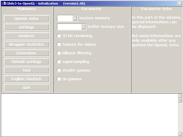 texture-memory: Here you can choose, how much available texture-memory has to be told to the game. You have to be aware, not to choos a too big value: the graphiccard-driver could be forced to out-source textures. There are also some drivers, which can't handle the textures, if you chosse a too high value: texture-glitches appear. The optimal value depends on the hardware, the settings and the driver. If you queried the OpenGL-infos, there will be made a suggestion on the right hand side. But that value is rounded to floor, so a higher performance might be achieved, if you set the texture-memory a little bit higher. buffer-texture-size: Here you can change the size of the textures, the wrapper uses to buffer the textures of the game. The smaller the buffer-textures, the more game-textures fit onto the graphiccard, but the larger the buffer textures, the more game-textures fit inito one single buffer-texture..... The best value depends on the graphiccard and the texture-memory, but I think 1024x1024 is a quite good value. 32 Bit rendering: If activated and rendering in fullscreen-mode, the display will be set up with 32bit color-depth and the wrapper renders in 32bit, too. I added this option, 'cause there might be some drivers, which can't handle the 16bit-mode that is normally used. textur for videos: if activated, videos won't be shown on the display directly, but via a texture. There are enough drivers where this works far better, so its activated in general. bilinear filtering: If activated and supported by the driver, the wrapper renders the scene to a texture first, and from there on the screen. This extra-step reduces the framerate but increases the image-quality if desktopresolution is activated. supersampling: if activated and "WGL_ARB_render_texture" is activated,too, the rendering will be done in a 4times higher resolution, this costs additional performance but benefits in a sharper image-quality. shader-gamma: If activated and supported by the driver, the gamma-/contrast-settings will be realized by shaders instead of the monitor-settings. This reduces the performance again, but has some benefits: screenshots are automatically gamma-correct, in window-mode the gamma-setting only affects the window. no gamma: if activated, the wrapper won't touch the gamma-settings. OpenGL-infos: Here it is possible to query for some infos about the OpenGL-driver. settings: Here you can change the settings which affect the behaviour of the window itself. renderer: Here you can change render-internal settings. Wrapper-statistics: Here you can choose, which additional informations have to be shown in the render-window. Extensions: Here you can decide which OpenGL-extensions have to be used by the wrapper or not. Default settings: Here you can undo every changes. Test: A quick test. English/Deutsch: Switch to german language. Quit: Quits the program. |